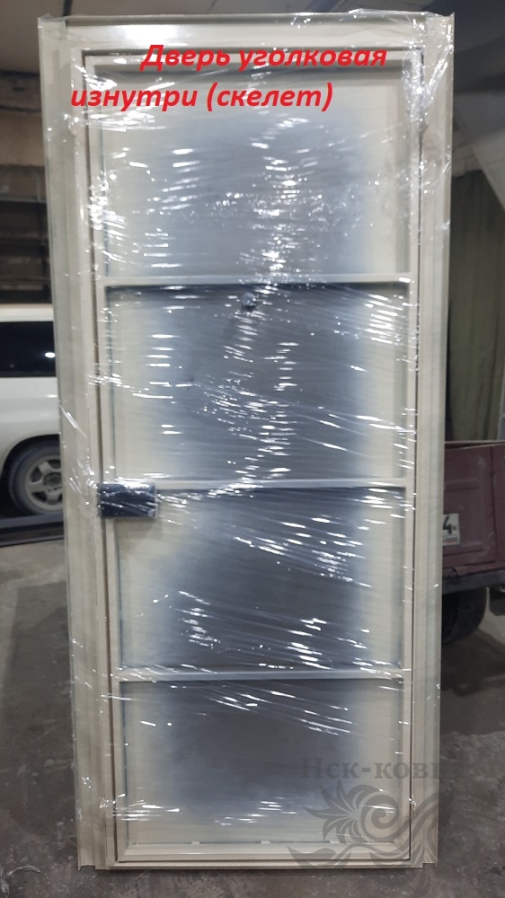 - Сварной каркас с ребрами жесткости и дверную коробку изготавливаем из уголка или профильной трубы 40х40 мм с полкой 4 мм, каждый шов тщательно проверяем на прочность.